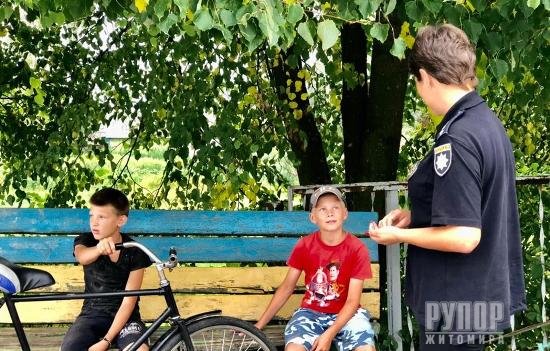 Поліцейські ювенальної превенції та секторів реагування у рамках комплексних профілактичних заходів проводять на Житомирщині попереджувальну роботу серед юних учасників дорожнього руху для їх безпечного літнього відпочинку. 22 липня така зустріч правоохоронців з юними жителями відбулась у Романівській територіальній громаді. Зокрема, у с. Старочуднівській Гуті поліцейські поспілкувались із маленькими велосипедистами. При цьому нагадали їм правила безпечної поведінки на дорозі та закликали дотримуватись їх. Також розповіли про необхідність оснащення двоколісників світлоповертачами та чому це важливо у сутінках чи в темну пору доби. – За пів року на Житомирщині сталось 79 ДТП за участі дітей, 73 з них – із постраждалими. У цих автопригодах 7 дітлахів загинули та ще 80 отримали травми різного ступеню тяжкості, - повідомив начальник Управління превентивної діяльності ГУНП Житомирщини Віталій Магалецький. – Щоб попередити такі прикрі випадки, наші працівники проводять попереджувальну роботу у молодіжному середовищі. Під час навчального року – у школах, влітку – у таборах відпочинку і місцях дозвілля малечі. Правоохоронці закликають громадян відповідально ставитись до безпеки дітей. Не забувайте постійно нагадувати їм правила безпечної поведінки, чого б вони не стосувались. Подбайте, аби літній відпочинок ваших школярів не затьмарився неприємними подіями. Нагадуємо, нині на Житомирщині, як і по всій Україні, працівники поліції розпочали комплексні профілактичні заходи щодо безпеки дорожнього руху.