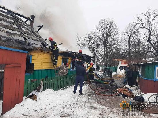 25 січня о 10:25 до Служби порятунку «101» надійшло повідомлення про пожежу в приватному дерев’яному будинку в с. Холосне Коростенського району. Ще до приїзду рятувальників, господар та місцеве населення намагалися відрами загасити пожежу. На місці події бійці ДСНС встановили, що вогонь охопив дах по всій площі (72 кв.м) та приміщення оселі. Існувала загроза поширення полум’я на поруч розташований сарай. Рятувальники викликали допомогу – основі сили залучалися на сам осередок горіння, додаткові на підвіз води. Під час рятування із полум’я речей домашнього вжитку господар отримав опіки обличчя. Лікарі надали потерпілому медичну допомогу та госпіталізували. Вогнеборці пожежу о 10:55 локалізували та о 12:50 ліквідували. Вогнем знищено дах будинку та кімнати. Не допущено перекидання полум’я на сарай. Попередня причина пожежі – коротке замикання електромережі. Остаточна причина встановлюється фахівцями.