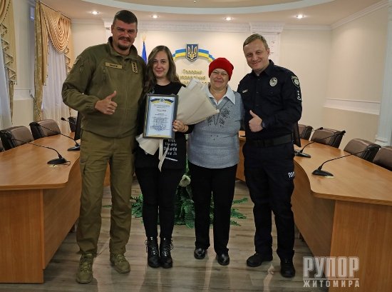 – Сміливість, відчайдушність і рішучість українців у справі захисту їм належного – наша сильна національна риса. Дякуємо вам за реальну допомогу поліцейським! – зазначив т.в.о. начальника ГУНП Житомирщини Артем Лисогор, вручаючи заохочення бердичівлянці.