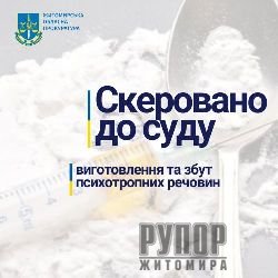 Злочин у сфері незаконного обігу психотропних речовин викрито Житомирською обласною прокуратурою спільно з Житомирським управлінням Департаменту внутрішньої безпеки Нацполіції України та Головним управлінням Нацполіції в області, яке проводило досудове розслідування. Примітка: відповідно до ст. 62 Конституції України особа вважається невинуватою у вчиненні злочину і не може бути піддана кримінальному покаранню, доки її вину не буде доведено в законному порядку і встановлено обвинувальним вироком суду.