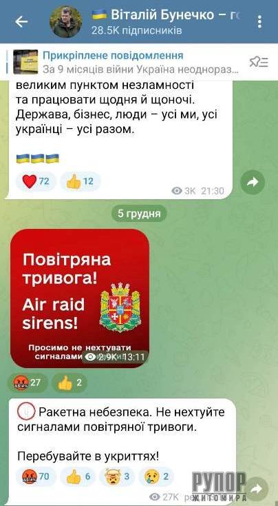 Голова Житомирської ОВА Віталій Бунечко попереджає про ракетну небезпеку та радить не нехтувати сигналами повітряної тривоги і перебувати в укриттях.