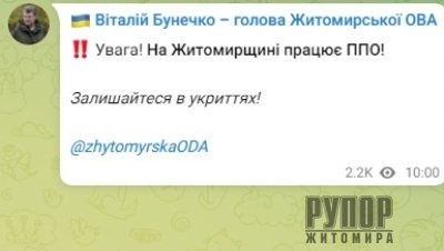 На Житомирщині працює ППО! Про це повідомляє голова Житомирської ОВА Віталій Бунечко.