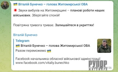 «Звуки вибухів на Житомирщині – планові роботи наших військових. Зберігайте спокій!