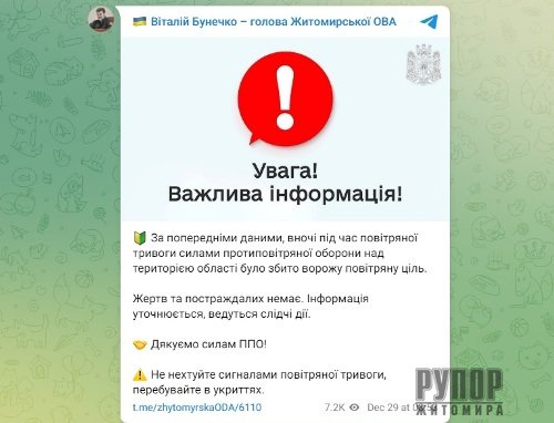 За попередніми даними, вночі під час повітряної тривоги силами протиповітряної оборони над територією області було збито ворожу повітряну ціль. Як стало відомо https://ruporzt.com.ua, про це повідомляє голова Житомирської ОВА Віталій Бунечко. «За попередніми даними, вночі під час повітряної тривоги силами протиповітряної оборони над територією області було збито ворожу повітряну ціль Жертв та постраждалих немає. Інформація уточнюється, ведуться слідчі дії. Дякуємо силам ППО! Не нехтуйте сигналами повітряної тривоги, перебувайте в укриттях», - наголошує Віталій Бунечко.