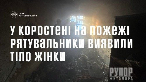 28 лютого о 06:13 до Служби порятунку «101» надійшло повідомлення про пожежу у квартирі п’ятиповерхового житлового будинку у м. Коростень. Телефонували сусіди, які відчули запах диму у будинку. По прибуттю бійців ДСНС спостерігалось сильне задимлення в квартирі та горів диван у одній із кімнат. В сусідній кімнаті на дивані рятувальники виявили тіло 86-річної власниці без ознак життя. О 06:40 бійці ДСНС локалізували пожежу та о 07:10 — ліквідували. Вогнем знищено меблі, речі домашнього вжитку та оздоблення стін. Наразі причина пожежі встановлюється фахівцями.