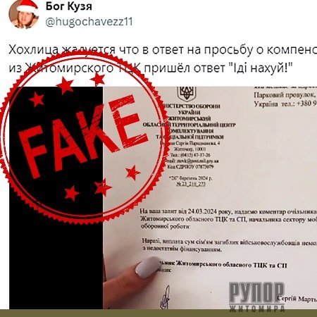 На відео жінка скаржиться українською мовою, що їй відмовили у виплаті за загиблого чоловіка на фронті. «Така особа не зверталася до Житомирського ТЦК та СП за оформленням виплат. Документ на відео не відповідає стандартам діловодства ЗСУ», - повідомив заступник начальника сектору соціальних виплат Житомирського ТЦК та СП Олександр Негерей. Він також додав, ТЦК не займаються призначенням одноразової грошової допомоги та її розмірами. ТЦК не є розпорядником бюджетних коштів. Просимо звернути увагу, що роспропаганда постійно спекулює на болючих темах українців: намагаючись зіграти на емоціях! Головна мета ворога – дискредитувати роботу ТЦК використовуючи фейкові відео, які розповсюджуються у соцмережах. Все це направлено для зриву мобілізації! Служба зв'язків з громадськістю Житомирського обласного ТЦК та СП