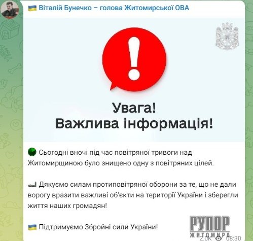 Сьогодні вночі під час повітряної тривоги над Житомирщиною було знищено одну з повітряних цілей. Про це повідомляє Віталій Бунечко – голова Житомирської ОВА. «Дякуємо силам протиповітряної оборони за те, що не дали ворогу вразити важливі об'єкти на території України і зберегли життя наших громадян! Підтримуємо Збройні сили України!», - наголошує Віталій Бунечко.