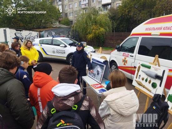 25 жовтня рятувальники та патрульні поліцейські завітали до учнів житомирського ліцею №6, аби навчити їх правилам безпеки. До проведення заходу був залучений мобільний клас з мінної безпеки. Надзвичайники детально розповіли про види боєприпасів, їх вибухові властивості та продемонстрували на 3Д-макетах особливості їх ідентифікації. На життєвих прикладах разом із присутніми обговорили як діяти при виявленні вибухонебезпечних предметів та щоб не сталося трагедії. Усі бажаючі фотографувалися на згадку, а ті, хто мав свої історії про виявлення невідомих знахідок, мали змогу ними поділитися. Також школярі із задоволенням приміряли спеціальні засоби правоохоронців, сиділи у поліцейському авто та вивчали правила безпеки дорожнього руху.
