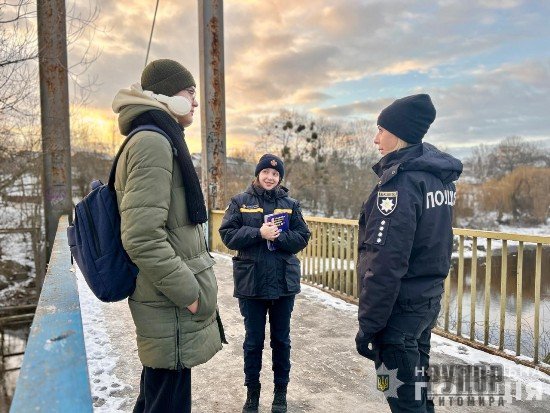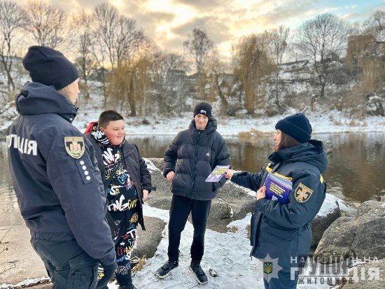 14 січня ювенальні інспектори Звягельського районного відділу поліції спільно зі співробітниками ДСНС провели профілактичний рейд у райцентрі на березі річки Случ, аби запобігти трагічним випадкам у зимовий період. Під час бесід правоохоронці та рятувальники закликали дорослих та дітей дотримуватися елементарних правил безпеки, розповіли про алгоритм дій на випадок, якщо людина опинилася у крижаній воді, а також нагадали про небезпеку виходу на тонку кригу. Водночас поліцейські розповіли дітям про заборону перебувати наодинці поблизу річки та роздали тематичні листівки. Відтак правоохоронці нагадують, що у жодному разі не можна: - виходити на тонкий лід та перевіряти його міцність стрибками або ударами ніг; - перебувати на одній ділянці замерзлої водойми великими групами; - ловити рибу занадто далеко від берега та робити багато лунок близько одна від одної, якщо зібралися порибалити. Шановні громадяни, у разі виникнення ситуацій, що потребують сторонньої допомоги, зверніться до поліції (за номером 102) або до рятувальників (за номером 101). Будьте обережними! Пам’ятайте, що ваша безпека у ваших руках.