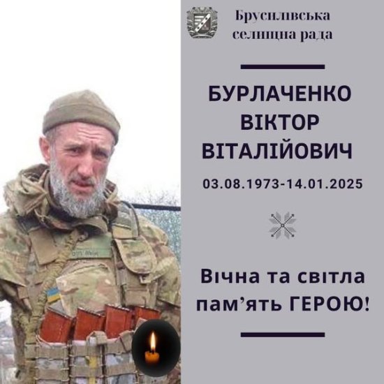Сьогодні Брусилівська громада попрощалась із Захисником України Віктором Бурлаченко. "Нашому суму немає кінця... На щиті повернувся на батьківщину батьків наш ГЕРОЙ, Бурлаченко Віктор Віталійович, найкращий з солдат Окремого Батальйону Спеціального Призначення. Він героїчно пройшов зони бойових дій: Кліщіївка, Курдюмівка, Бахмут, Сіверськ, Іванівське. Загинув в тяжкому бою 14.01.2025 в районі н.п. Котлине, Покровського району, Донецької області, рятуючи своїх 6 побратимів. Висловлюємо щирі співчуття рідним та близьким Віктора Віталійовича... Вічна слава і світла пам’ять нашому захиснику-ГЕРОЮ!" - йдеться у повідомленні Брусилівської селищної ради.
