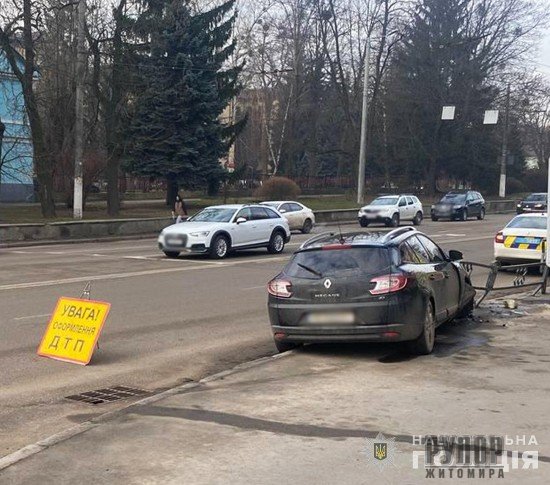 Дорожньо-транспортна пригода трапилась 30 січня близько 9:20 в обласному центрі, на перехресті вулиць Великої Бердичівської та Жуйка. На місці події працювала слідчо-оперативна група Житомирського райуправління поліції. Попередньо, 45-річна бердичів’янка, керуючи автомобілем «Renault Megane», не впоралася з керуванням на повороті, виїхала за межі проїзної частини та допустила зіткнення з металевим парканом. Внаслідок ДТП пасажирка автомобіля, 20-річна жителька Бердичева, отримала травми та була госпіталізована до міської лікарні. Нині слідчі поліції з’ясовують обставини події у рамках кримінального провадження, розпочатого за ч. 1 ст. 286 (Порушення правил безпеки дорожнього руху або експлуатації транспорту особами, які керують транспортними засобами) КК України. Шановні водії! Поліція вкотре наголошує на суворому дотриманні Правил дорожнього руху! Під час керування автомобілем дотримуйтесь швидкісного режиму, адже це допоможе вам вберегтись від неприємних і фатальних дорожніх обставин. Обов’язково користуйтесь пасками безпеки. Перед виконанням маневрів завжди переконуйтеся, що це безпечно для вас та інших учасників руху.