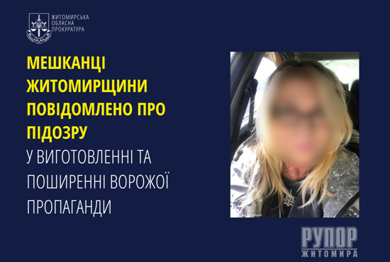 За процесуального керівництва Житомирської обласної прокуратури повідомлено про підозру місцевій мешканці за фактом виготовлення, поширення матеріалів, у яких міститься виправдовування та заперечення збройної агресії рф проти України, у тому числі шляхом представлення збройної агресії рф проти України як внутрішнього громадянського конфлікту з використанням засобів масової інформації, вчинених повторно (ч. 3 ст. 436-2 КК України).