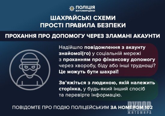Саме про таку ситуацію правоохоронцям Житомирського районного управління поліції №1 розповіла 36-річна житомирянка. Жінка отримала повідомлення від знайомої у мобільному застосунку з проханням про позику у понад 7 тисяч гривень. Потерпіла одразу ж зробила переказ на вказану у повідомленні картку. А згодом поспілкувалася зі знайомою та дізналась, що насправді та не потребувала такої допомоги, а її акаунт зламано.