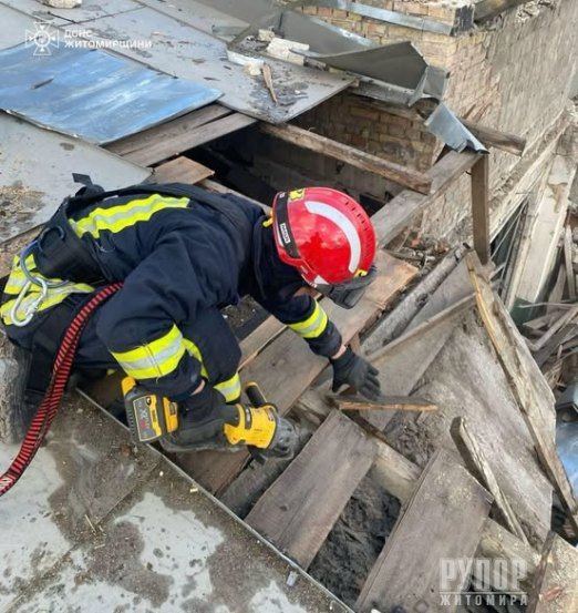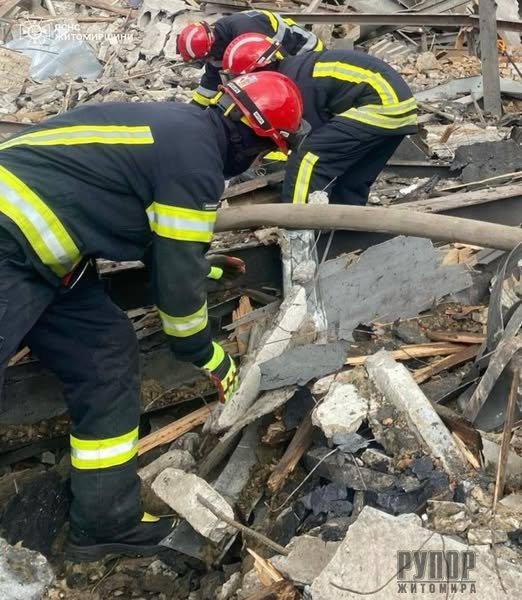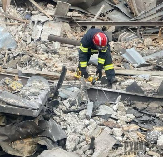 Фахівці аварійно-рятувального загону ДСНС Житомирщини проводять роботи з розбору завалів, зокрема демонтаж аварійних плит та розчищення поверхів будівлі від залишків бетонних конструкцій.