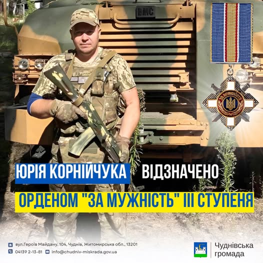 Президент України Володимир Зеленський відзначив орденом «За мужність» ІІІ ступеня нашого земляка — жителя селища Великі Коровинці, старшого сержанта Юрія Володимировича КОРНІЙЧУКА, бійця Штурмовий полк НПУ «Сафарі» Об’єднаної штурмової бригади Національної поліції України «Лють». Про це повідомляє Чуднівська міська рада. "Нагороду вручено за особисту мужність і самовіддані дії під час захисту державного суверенітету та територіальної цілісності України, забезпечення національної безпеки й оборони, відсічі й стримування збройної агресії рф, а також за вірність Присязі. Дякуємо Юрію та його побратимам за відвагу й незламність. Пишаємося вами! Дякуємо ЗСУ та всім, хто тримає небо над Україною. Слава Україні! Героям слава!" - йдеться у повідомленні.