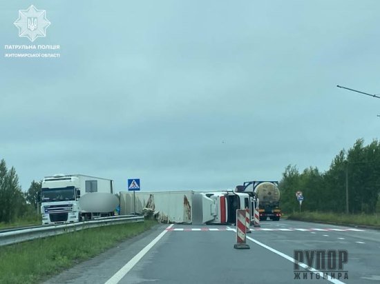 У звʼязку з дорожньо-транспортною пригодою без потерпілих на 221 км автодороги М-06 Київ — Чоп (об'їзна міста Звягеля), рух транспорту частково ускладнений в обох напрямках, та здійснюється крайніми правими смугами. Як встановили патрульні, водій вантажівки не врахував дорожньої обстановки, не вибрав безпечної швидкості руху та наїхав на колесовідбійник. В результаті чого відбулося перекидання. На керманича Volvo ми склали протокол за ст. 124 (Порушення ПДР, що призвело до ДТП) КУпАП. Патрульні забезпечують регулювання та безпеку дорожнього руху. Водії, плануйте маршрут своєї поїздки з урахуванням цієї інформації.