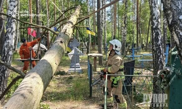 У селищі Діброва Коростенського району рятувальники оперативно прибрали два дерева, які надломилися й нависали над могилами на місцевому кладовищі. Через сильний вітер гілля могло в будь-який момент впасти просто на памʼятники.