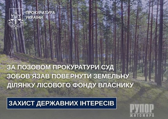 За втручання Спеціалізованої екологічної прокуратури Житомирської обласної прокуратури суд зобов’язав підприємство повернути Житомирській обласній військовій адміністрації ділянку лісового фонду. Встановлено, що підприємство з 2008 року на підставі договору про довгострокове тимчасове користування лісовою ділянкою користувалося земельною ділянкою лісового фонду площею 2,2 га, яка знаходиться в 25 кварталі Корнинського лісництва та в порушення умов договору, після закінчення терміну його дії, не повернуло постійному користувачу чи власнику лісів лісову ділянку. З метою захисту державних інтересів, у січні 2025 року Коростишівська окружна прокуратура подала до суду позов в інтересах держави – в особі Житомирської обласної військової адміністрації. У позові вимагалося зобов'язати повернути земельну ділянку у володіння власника Житомирської обласної військової адміністрації та в користування постійному лісокористувачу. Господарський суд Житомирської області повністю задовольнив позов прокуратури. Джерело: https://ruporzt.com.ua/oblasni_novini/229152-za-pozovom-prokuraturi-sud-zobovyazav-povernuti-zemelnu-dlyanku-lsovogo-fondu-vlasniku.html