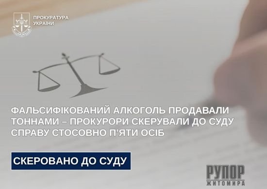 П’ятеро мешканців Житомирщини упродовж 2024-2025 років налагодили діяльність по незаконному придбанню, зберіганню, транспортуванню та продажу фальсифікованих алкогольних напоїв. За результатами санкціонованих обшуків за місцями проживання обвинувачених, у гаражних та підсобних приміщеннях, їхніх автомобілях виявлено та вилучено майже півтори тонни алкогольних напоїв та спирту, готівкові гроші та інші докази неправомірної діяльності. Житомирською обласною прокуратурою скеровано обвинувальний акт разом із угодами про визнання винуватості стосовно п’яти осіб за фактом незаконного придбання, зберігання та збуту підакцизних товарів (ч. 2 ст. 28, ч. 1 ст. 204 КК України). Санкція статті передбачає покарання у виді штрафу від п’яти тисяч до десяти тисяч неоподатковуваних мінімумів доходів громадян з конфіскацією та знищенням незаконно виготовлених товарів. Досудове розслідування здійснювали слідчі ГУНП в області за оперативного супроводу Житомирського ДВБ Національної поліції України. Примітка: відповідно до ст. 62 Конституції України особа вважається невинуватою у вчиненні злочину і не може бути піддана кримінальному покаранню, доки її вину не буде доведено в законному порядку і встановлено обвинувальним вироком суду. Джерело: https://ruporzt.com.ua/oblasni_novini/229329-falsifkovaniy-alkogol-prodavali-tonnami-prokurori-skeruvali-do-sudu-spravu-stosovno-pyati-osb.h