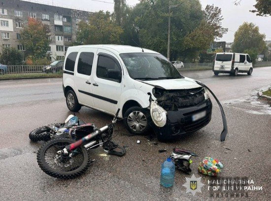 Дорожньо-транспортна пригода сталася 8 жовтня близько 15:30 на перехресті вулиць Київської та Степана Бандери в місті Коростишеві. Попередньо, 38-річна місцева жителька, керуючи автомобілем Renault Kangoo, допустила зіткнення з мотоциклом Geon Dakar, за кермом якого перебував 39-річний житель міста Коростишева. У результаті ДТП травми отримав водій двоколісника. Його було госпіталізовано до реанімаційного відділення міської лікарні. Нині слідчі відділу поліції №1 (Коростишів) Житомирського райуправління №2 встановлюють обставини події в межах кримінального провадження, розпочатого за ч. 1 ст. 286 (Порушення правил безпеки дорожнього руху або експлуатації транспорту особами, які керують транспортними засобами) КК України.Поліція закликає водіїв: перед виконанням маневру на дорозі переконайтеся, що це буде безпечно для вас та інших учасників руху. Враховуйте стан дорожнього покриття, погодні умови, дотримуйтеся безпечної швидкості та дистанції. Керманичі двоколісників, дбайте про справність свого двоколісника та обов’язково використовуйте захисні шоломи. ] Джерело: https://ruporzt.com.ua/oblasni_novini/229447-korostishvsk-polceysk-vstanovlyuyut-obstavini-travmuvannya-motociklsta-v-dtp.html