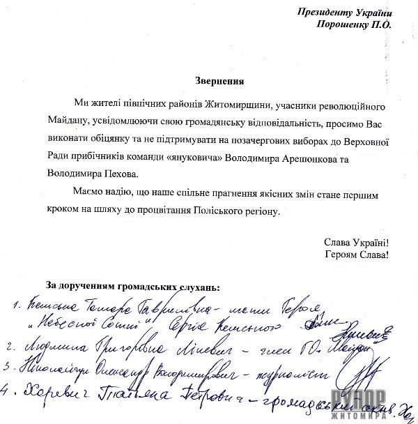 Президента Петра Порошенка. Жителі Коростенського, Олевського, Овруцького, Лугинського районів просять Президента України не підтримувати на позачергових виборах до Верховної Ради