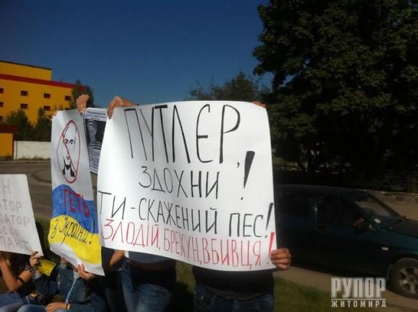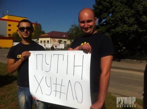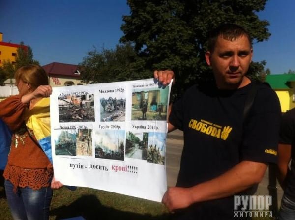 6 вересня 2014 року в місті Коростишеві пройшла патріотична акція «Хутін – руки геть від України». Свідомі патріоти України зібралися для розповсюдження листівок «БОЙКОТУЙ РОСІЙСЬКЕ» та «ПІДТРИМАЙ УКРАЇНСЬКУ АРМІЮ». Згодом активісти з плакатами на тему «Стоп – путін» вишикувались вздовж дороги по вулиці Більшовицькій та викрикували націоналістичні та антиросійські гасла. Свободівець Юрій Дідківський розповів: «Люди, які долучалися до акції, малювали свої плакати, виходили з державними прапорами. Автомобілі проїжджаючи повз сигнали в підтримку. Дякуємо учасникам та всім небайдужим за участь в акції. Ми в цій війні обов'язково переможемо». Прес-служба Житомирської обласної організації ВО «Свобода»