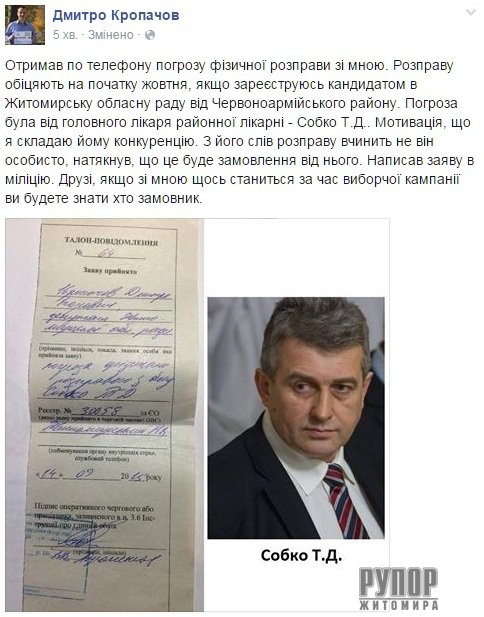 Депутат Житомирської обласної ради Дмитро Кропачов, який отримав погрозу фізичної розправи – написав відповідну заяву у міліцію. Про це депутат повідомив щойно в себе на сторонці у Фейсбук. «Отримав по телефону погрозу фізичної розправи зі мною. Розправу обіцяють на початку жовтня, якщо зареєструюсь кандидатом в Житомирську обласну раду від Червоноармійського району. Погроза була від головного лікаря районної лікарні - Собко Т.Д.. Мотивація, що я складаю йому конкуренцію. З його слів розправу вчинить не він особисто, натякнув, що це буде замовлення від нього. Написав заяву в міліцію. Друзі, якщо зі мною щось станиться за час виборчої кампанії ви будете знати хто замовник».