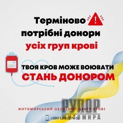 Житомирський обласний центр крові має потребу у донорах усіх груп крові