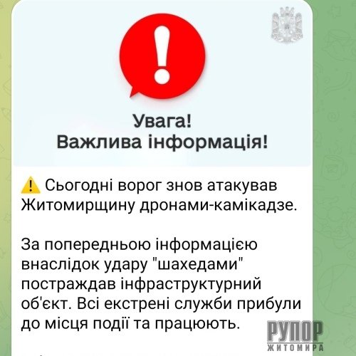 За попередньою інформацією внаслідок удару "шахедами" постраждав інфраструктурний об'єкт. Всі екстрені служби прибули