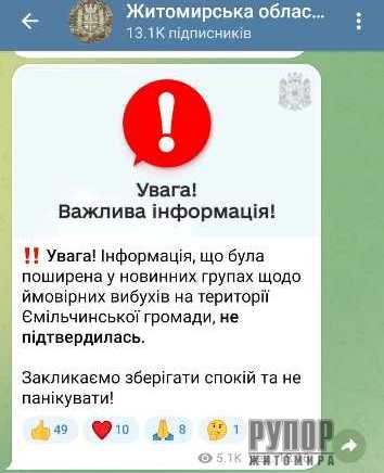 Увага! Інформація, що була поширена у новинних групах щодо ймовірних вибухів на території Ємільчинської громади, не підтвердилась.