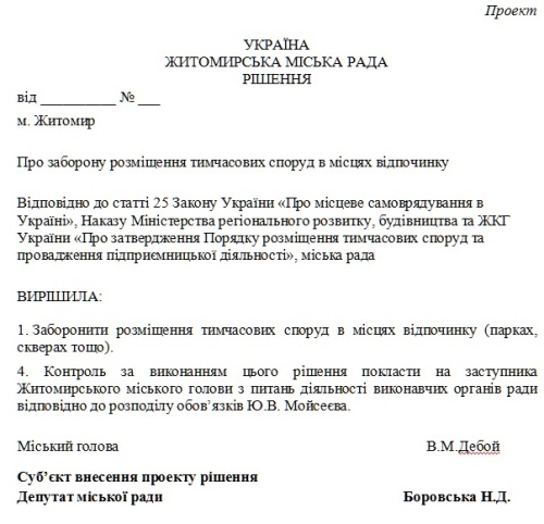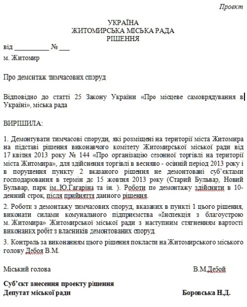 Нажаль суб´єкти підприємництва, що отримують дозвіл на сезону торгівлю морозивом та безалкогольними напоями не дотримуються законодавства, і активно здійснюють торгівлю пивом та слабоалкогольними напоями. А контролюючі органи не виконують своїх обов´язків, тим самим стимулюючі дані порушення, а не запобігаючи їм. Що видно не озброєним оком, коли в центрі міста, в місцях відпочинку тотальний «бєспрєдєл», влада бачить це, знає, але ніяк не реагує. Тому, з метою забезпечення порядку у місцях відпочинку міста Житомира, зменшення доступності дітей та молоді до пива, слабоалкогольних виробів, пропоную заборонити розміщення будь-яких тимчасових споруд в місцях відпочинку (парках, скверах тощо). Також демонтувати тимчасові споруди, які розміщені на території міста Житомира на підставі рішення виконавчого комітету Житомирської міської ради від 17 квітня 2013 року № 144 «Про організацію сезонної торгівлі на території міста Житомира», для здійснення торгівлі в весняно - осінній період 2013 року і в порушення пункту 2 вказаного рішення не демонтовані суб’єктами господарювання в термін до 15 жовтня 2013 року (Старий Бульвар, Новий Бульвар, парк ім..Ю.Гагаріна та ін. ).