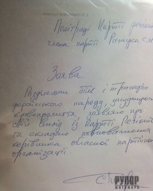 Як повідомляють джерела в облдержадміністрації, щойно голова Житомирської ОДА Сергій Рижук заявив про свій вихід з Партії регіонів і склав повноваження голови обласної організації ПР. "Розділяючи біль і трагедію Українського народу, засуджуючи кровопролиття, заявляю про свій вихід із «ПАРТІЇ РЕГІОНІВ» та складаю повноваження керівника обласної партійної організації."- йдеться у заяві.