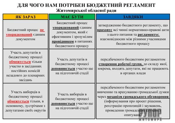 12 березня на 22 сесії Житомирської обласної ради буде роглянуто поданий депутатом Дмитром Кропачовим доопрацьований проект рішення «Про затвердження Бюджетного регламенту Житомирської обласної ради».