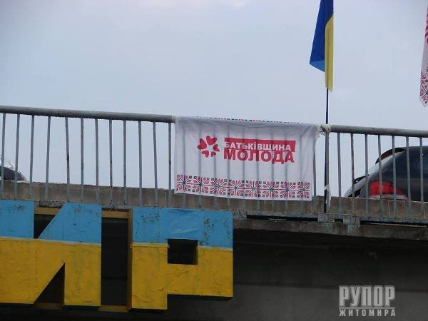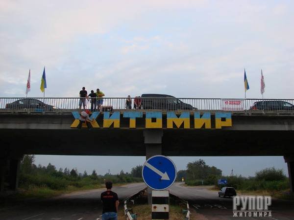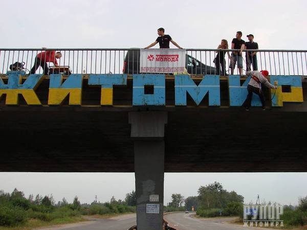 Активісти Житомирської обласної організації «Батьківщина Молода» разом з друзями розфарбували в’їзний знак у місто в жовто-блакитні кольори. «Батьківщина Молода» продовжує акцію з розфарбовування знаків-назв міст, що знаходяться на під’їзних шляхах до них. Так, 12 серпня активісти Житомирської «Батьківщини Молодої» перефарбували знак, що знаходиться на в’їзді до міста, у національні кольори. Учасник акції зазначили, що це невеликий, але такий важливий вклад у підтримання патріотичного духу, особливо у складний для України час. Вони наголосили, що будуть продовжувати акцію й надалі. Нагадаємо, що акція ініційована та проводиться активістами «Батьківщини Молодої» у всіх регіонах України у зв’язку зі складною політичною ситуацією та задля підтримки патріотичного духу населення, збереження суверенності та цілісності держави.