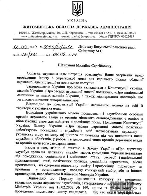 19 вересня 2014 року депутат Богунської районної ради міста Житомир свободівець Михайло Сліпченко отримав відповідь на звернення ( http://www.zhytomyr.svoboda.org.ua/diyalnist/novyny/053546/) до керівництва Житомира та области з пропозицією організувати серед житомирських чиновників іспит з української мови. Ідеться про диктант на рівні 11-го класу шкільної програми, мета написання якого – популяризація державної мови та перевірка держслужбовців на знання української орфографії. У відповідях, що надійшли за підписами в. о. міського голови та першого заступника голови облдержадміністрації, керманичі области мотивують свою відмову написати диктант нормами "законодавства України про мови" (дослівно цитата з листа), законом "Про державну службу", законом "Про засади державної мовної політики" та Порядком проведення конкурсу на заміщення вакантних посад державних службовців. Ці документи, з одного боку, зобов'язують посадових і службових осіб застосовувати державну – українську мову як мову офіційного спілкування під час виконання держслужбовцями своїх повноважень, а з иншого – не передбачають проведення іспиту з української мови при прийнятті на державну службу. "Дивує саме формулювання відмови очільників міста та области написати диктант. Між рядків вбачається банальний страх посадовців перед українською мовою. Наголошую, що за підсумками пройденого іспиту авторів найкращих робіт ми пропонували відзначити патріотичними подарунками, таким чином демонструючи мешканцям Житомирщини високий рівень підготовки наших чиновників. Схоже на те, що таких людей у нас на державній службі, на жаль, обмаль", – прокоментував Михайло Сліпченко. "Прикро, що житомирські керманичі не скористалися можливістю перевірити себе на реальне знання державної мови. Це мало бути гарною репетицією перед обов'язковим іспитом з української мови для кожного держслужбовця. Ця норма передбачена в "Програмі захисту українців" Всеукраїнського об'єднання "Свобода". Переконаний, що Верховна Рада наступного скликання ухвалить цей закон. Іспит з державної мови буде черговим етапом люстрації, закон про яку ухвалила Верховна Рада за ініціятиви "Свободи", – зазначив голова Житомирської обласної організації Всеукраїнського об'єднання "Свобода" Сидір Кізін. Прес-служба Житомирської обласної організації ВО «Свобода»