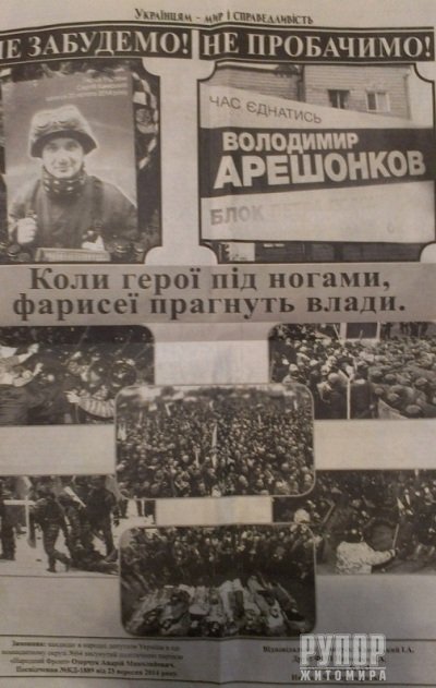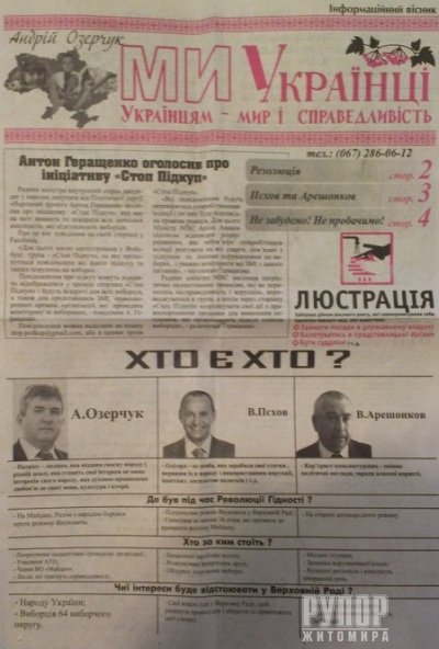 Центральний матеріал на першій шпальті «Антон Геращенко оголосив ініціативу «Стоп підкуп». У ній йдеться про те, що радник міністра внутрішніх справ створив групу у ФБ «Стоп підкуп», на яку пропонується повідомляти всі факти підкупу та інших порушень на виборах. Ймовірно, публікуючи цей матеріал, Озерчук і Камінський намагались доєднатися до когорти патріотичних громадян і борців з корупцією. Водночас, хочу повідомити, що я уже розмістив у фейсбуці у цій групі ці фото:
