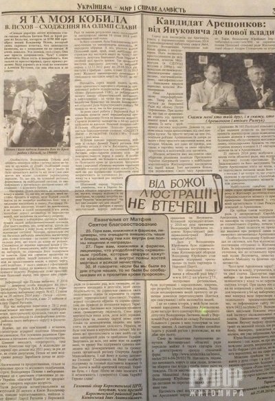 Третя шпальта газети Андрія Озерчука присвячена його головним конкурентам на цьогорічних позачергових виборах – Володимиру Пехову і Володимиру Арешонкову. Про них окремі статті. Про Володимира Пехова написав особисто лікар Іван Камінський. Статтю про Володимира Арешонкова передрукували з сайту «Цензор.нет». Я зайшов за цим посиланням на сайт «Цензор.нет». Там дійсно є подібний текст, але російською мовою і в значно скороченому вигляді. Тобто, цього тексту на сайті, на якій посилаються у газеті, немає. Питання до відповідального за вихід газети Івана Камінського: самі дописували чи хтось допоміг?