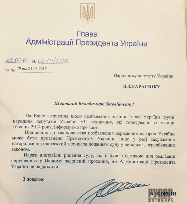 Володимир Парасюк вимагає зняти з народного депутата Володимира Литвина звання «Герой України». Причина - голосування за Закони від 16 січня 2014 року. «... Володимир Литвин, В’ячеслав Богуслав, Борис Дейч, Володимир Бойко, Леонід Литвинов, Олександр Риженков, Юхим Звягільський, Леонід Байсаров. Оскільки голосування за Закони від 16 січня 2014 року є важким злочином перед народом України вважаю, що вищезгадані особи не мають морального права носити високе звання Герой України. Відтак, вимагаю розглянути можливість зняття звання Герой України з вказаних мною осіб... і що відповів Президент...»