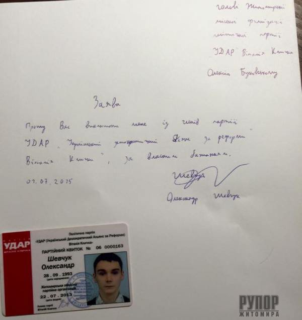 Олександр Шевчук вийшов з партії «Удар» Віталія Кличка. Громадський активіст приєднався до команди Житомирського «Народного Контролю». - Виходжу з партії «Удар», бо вже не довіряю її лідерові В.Кличку, як і не довіряю політраді партії. Бачу, що Кличко переймається власними політичними ставками, а не виконанням передвиборних обіцянок. Я молода людина і цілком усвідомлюю, що майбутнє моє і моїх співвітчизників визначається сьогодні і зараз. Часу зволікати і чекати просто немає. З багатьма активістами Житомирського «Народного Контролю» я знайомий з часів Революції Гідності. Ми не можемо зрадити наших виболених ідей. В «Народному Контролі» я бачу активну і рішучу команду, готову діяти. Це близькі по духу мені люди. Імпонує готовність команди вирішувати складні і задавнені проблеми, брати на себе відповідальність, готовність діяти, відчиняти чиновницькі кабінети та вимагати від «слуг народу» реальних і швидких дій: команда «Народного Контролю» працює для людей. Також бачу «Народний Контроль» платформою для обєднання громадських активістів, учасників Майдану, волонтерів, учасників АТО та журналістів. Маємо багато спільних планів і певен – скоро про них розповім. Також закликаю всіх громадських активістів приєднуватися до нас