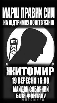 «19 вересня 2015р о 16:00 в місті Житомирі, від фонтана на майдані Соборном до обласного відділу міліції відбудеться марш правих сил "Свободу Патріотам!" на підтримку незаконно заарештованих патріотів.