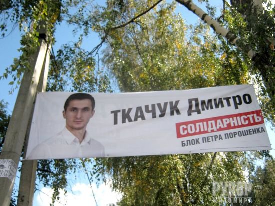 Накануне выборов в Житомире появился новый вид предвыборной агитации - рекламная растяжка на дереве. Об этом рассказала директор рекламно-информационной компании «Хелен» Елена Бойко. С недавних пор на улице Леси Украинки, неподалеку от перекрестка с улицей Щорса, пешеходы могутлицезреть рекламную растяжку Блока Петра Порошенко, которая закреплена на березе. На предвыборном баннере изображен председатель местной ячейки партии «Демократический Альянс», член житомирского исполкома Дмитрий Ткачук.«"Порадовал" рекламный ход от кандидата в депутаты. Один из противников любых рекламных конструкций в городе, по совместительству - член исполкома», - написала в соцсети Елена Бойко. Стоит отметить, что лидер житомирского БПП, первый заместитель мэра города, Сергей Сухомлин, выступал категорически против размещения подобных растяжек на заборах вдоль дорог, и даже инициировал введение штрафных санкций за размещение такого типа рекламы и политической агитации. Как сообщал «Журнал Житомира», председатель житомирской ячейки Всеукраинской партии «Демократический Альянс» Дмитрий Ткачук покинул партию и перешел в партию «Солидарность» - Блок Петра Порошенко».