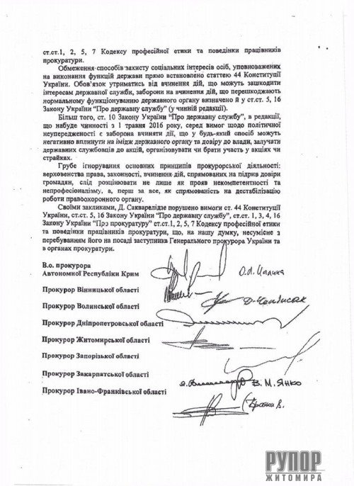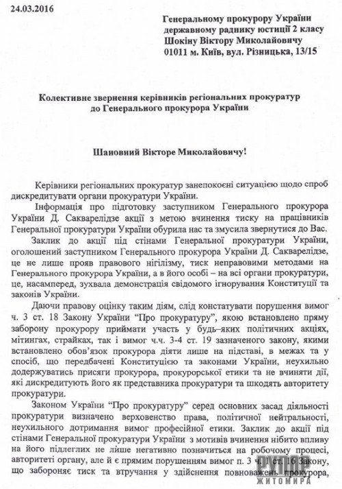 «Завтра 28.03.2016 року на 12 год. просимо всіх небайдужих до долі України підтримати всеукраїнську акцію проти прогнившої прокурорської системи і прийти до прокуратури Житомирської області!