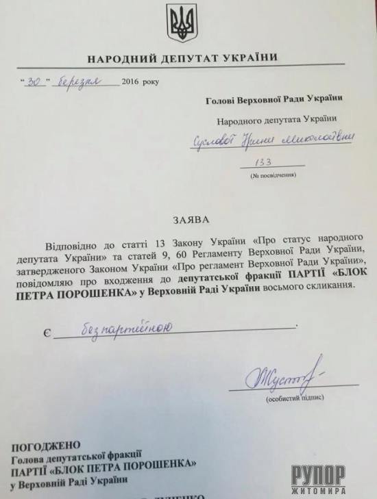 Житомирянка, народний депутат Ірина Суслова, яка пройшла до Верховної ради від Самопомочі, увійшла до складу фракції БПП. «У вирії жорсткої політичної боротьби ми забуваємо, що руйнуємо єдність країни. Для багатьох політиків власні амбіції стали важливішими за майбутнє держави. Потрібно припинити взаємоборювання і шукати шляхи об’єднання. У найкритичніші моменти нашої історії тільки в єдності вдавалося перемогти ворога. Саме це запорукою перемоги Революції гідності. Тоді мільйони нас, Українців, усвідомили, що ми маємо силу волі, аби захищати державу, своїх рідних та гідне життя. Ми маємо довести самим собі, усьому світові, що ми й зараз готові гідно пройти крізь усі випробування. Розумію усю складність ситуації, у якій зараз опинилася держава через непомірні амбіції політиків. Переконана, що легкого виходу із теперішньої кризи уже немає. Це потрібно визнати та діяти! Переможе або здоровий глузд, або примітивний популізм. Захопившись політичними баталіями, багато хто забуває про зовнішню безпеку України, про завтрашній день. А саме це зараз, на мою думку, є найголовнішим. Політичні торги рано чи пізно закінчаться, тільки що на виході отримають громадяни та держава? Тому, після довгих роздумів, прийняла рішення вступити у президентську фракцію партії «Блок Петра Порошенка». Рішення далося мені дуже не просто, бо усвідомлюю усі можливі політичні ризики. Проте, не бачу іншого шляху, окрім як об’єднання навколо Головнокомандуючого держави у критичні для історії часи. Тільки в єдності вбачаю шлях виходу із політичної кризи та зміцнення безпеки держави. Розраховую на Ваше розуміння та підтримку. Буду вдячна за Вашу чесну та відкриту позицію. Ми, Українці, неодмінно переможемо, бо будемо єдиними!», - пояснила свій вчинок політик.