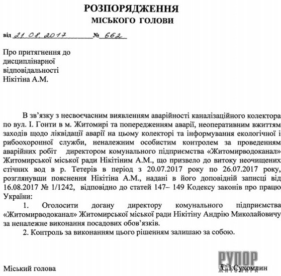 У зв’язку з несвоєчасним виявленням аварійності каналізаційного колектора по вулиці І. Гонти у місті Житомирі та попередженням аварії, неоперативним вжиттям заходів щодо ліквідації аварії на цьому колекторі та інш., що призвело до витоку неочищених вод в річку Тетерів, міський голова Сергій Сухомлин оголосив догану директору КП «Житомирводоканал» Андрію Нікітіну.