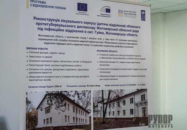 26 листопада у селищі Гуйва Житомирського району відбулося відкриття реконструйованого лікувального корпусу — дитячого інфекційного відділення обласного протитуберкульозного диспансеру Житомирської обласної ради. Роботи з реконструкції розпочали у 2021 році, але через повномасштабну війну їх було тимчасово зупинено. Завдяки відновленому фінансуванню цього року будівництво завершено. Проєкт реконструкції реалізовано в межах Програми відновлення України, що фінансується Європейським інвестиційним банком. На відкритті були присутні перший заступник голови Житомирської обласної ради Олег Дзюбенко, начальник Житомирської обласної військової адміністрації Віталій Бунечко та його заступниця Наталія Арендарчук, т.в.о. директора Департаменту охорони здоров’я Житомирської ОВА Валентина Донець, а також представники Європейського інвестиційного банку, Програми розвитку ООН, представництва Європейського Союзу в Україні та Міністерства розвитку громад і територій України. Нове дитяче інфекційне відділення з палатами інтенсивної терапії розраховане на 40 ліжок. Тут діагностуватимуть і лікуватимуть пацієнтів із різними інфекційними захворюваннями, зокрема гострими кишковими та повітряно-крапельними інфекціями. Пропускна здатність відділення становить 1200 пацієнтів на рік. У рамках проєкту проведено комплекс заходів із підвищення енергоефективності будівлі. Зокрема, утеплено фасади й підвали, замінено покрівлю, встановлено нові вікна й двері, оновлено інженерні мережі, устаткування та сантехніку. Це один із 12 проєктів, що реалізуються в Житомирській області у межах Програми відновлення України. Загалом у 2024 році на реалізацію цих проєктів, які охоплюють сфери освіти, охорони здоров’я, водопостачання, водовідведення та створення сучасного ЦНАПу, передбачено понад 300 мільйонів гривень із державного бюджету, залучених через Європейський інвестиційний банк.