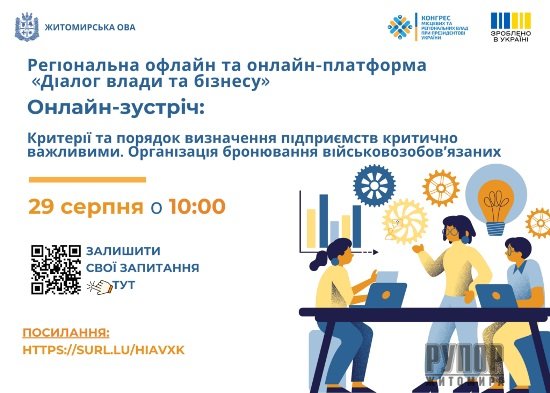29 серпня о 10:00 у рамках проєкту «Діалог влади та бізнесу» відбудеться чергове засідання на тему: «Критерії та порядок визначення підприємств критично