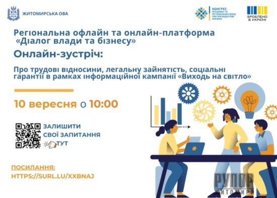 10 вересня о 10:00 у рамках проєкту «Діалог влади та бізнесу» відбудеться чергове засідання на тему: «Про трудові відносини, легальну зайнятість, соціальні