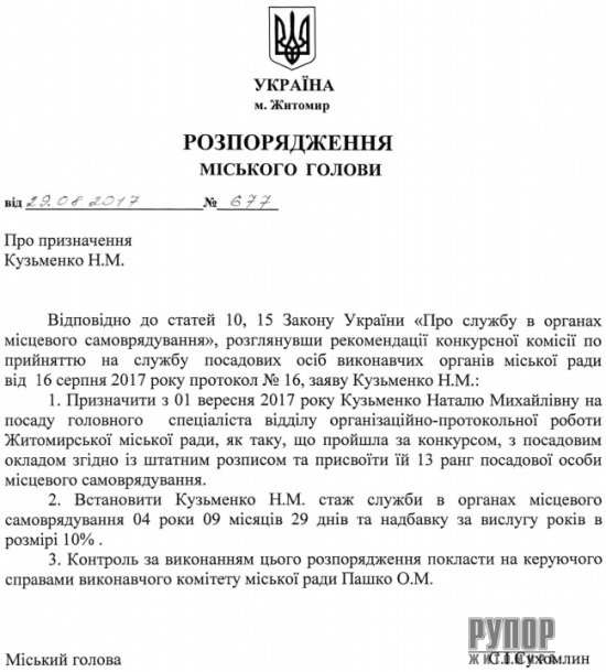 на посаду головного спеціаліста відділу організаційно-протокольної роботи Житомирської міської ради.