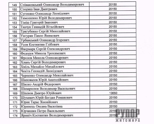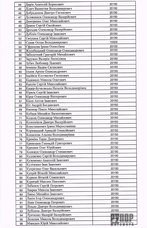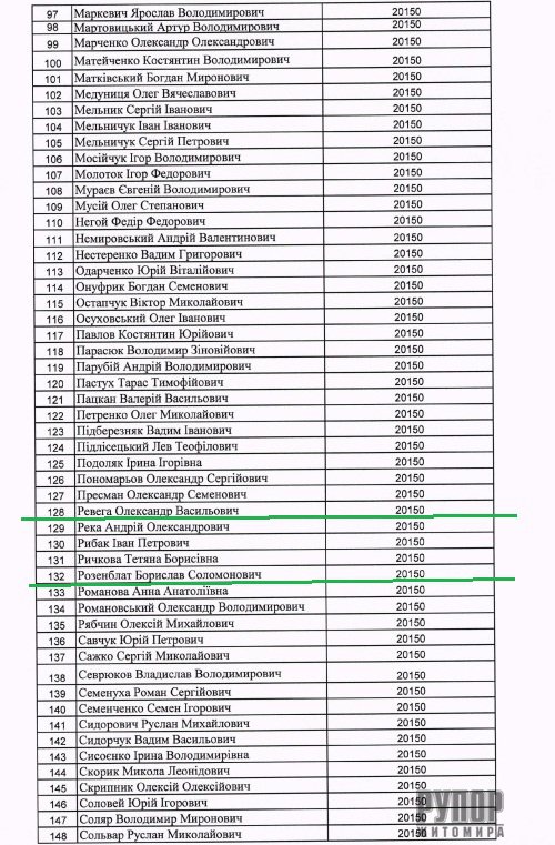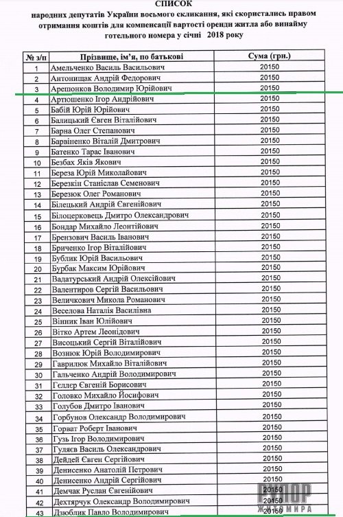 07 лютого 2018 року на офіційному сайті Верховної ради України Управління справами оприлюднило список народних депутатів України, яким здійснена виплата компенсації для оренди житла або винайму готельного номеру у СІЧНІ 2018 року. В списку є і представники Житомирської області: - Розенблат Борислав Соломонович - 20150 грн - Ревега Олександр Васильович - 20150 грн - Дзюблик Павло Володимирович - 20150 грн - Арешонков Володимир Юрійович - 20150 грн Компенсації народним депутатам України для оренди житла або винайму готельного номеру Список народних депутатів України, яким здійснена виплата компенсації для оренди житла або винайму готельного номеру у СІЧНІ 2018 року
