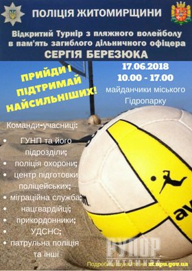 17 червня у житомирському Гідропарку Головне управління Національної поліції в області ініціює проведення першого відкритого турніру з пляжного волейболу в пам'ять загиблого дільничного офіцера Сергія Березюка. До спортивних змагань приєднаються не лише поліцейські, а й військовослужбовці Національної гвардії, прикордонники, рятувальники та працівники міграційної служби. У паркові майданчики запрошують житомирян та гостей міста.